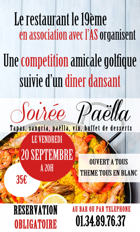 - A partir de 20h30 pour ceux qui le souhaitent, le restaurant propose une soirée paella au prix de 35€ avec DJ. Elle sera ouverte tout public, des tables seront réservées pour les membres de l’AS.