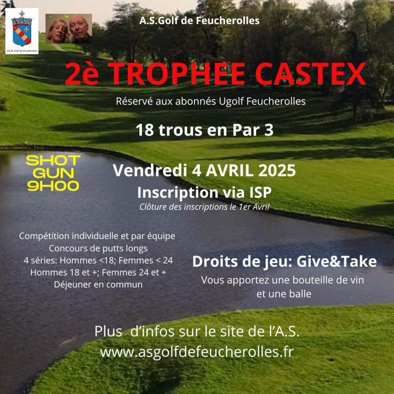 Le 2è Trophée Castex par 3 se déroulera ce 4 avril sur le terrain de Feucherolles. Il s'agit d'effectuer 18 trous réinstallés en Par 3. Un gros concours de précision organisé par Lorraine et Henri.