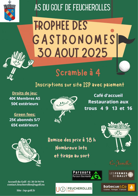 Vous l'attendez comme chaque année à la fin du mois d'août, l'AS du Golf de Feucherolles vous invite à participer en équipe et dans la convivialité au TROPHEE DES GASTRONOMES le Samedi 30 août 2025.
